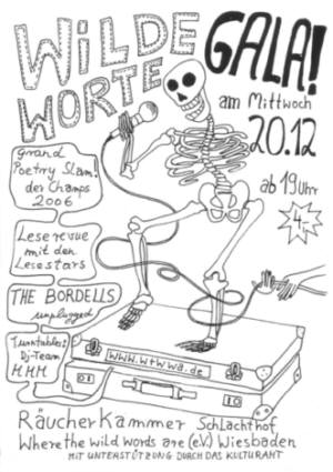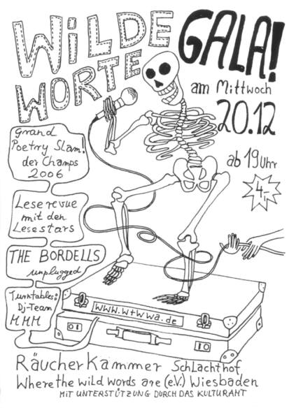 Mittwoch, 20.12.2006Wilde Worte Gala: Grand FinaleGrand Slam! der Slamsieger 2006+ Leserevue mit unseren Lesestars, Überraschungsgästen aus 8 Jahren wilde Worte + Livemusik mit THE BORDELLS (Unplugged) An den Plattentellern: Dj-Team: Mädels Machen Musik Ab 19:00 Uhr Eintritt 4,- Euro Man soll die Feste feiern wie sie fallen. WTWWA absolviert grade sein achtes Jahr und im Zeichen der liegenden 8, das Zeichen für Unendlichkeit und natürlich ewig währenden Ruhmes lehnen wir uns ein wenig zurück, zoomen Vergangenes heran und haben zur großen Jahresabschlußsause Überraschungsgäste aus 8 Jahren Wilde Worte eingeladen. Zuvor zelebrieren wir auch in diesem Jahr wieder den Grand Slam! bei dem das Publikum wie gewohnt unter den voraussichtlich sechs antretenden Dichtern den Wiesbadener Poetry Slam-King des Jahres 2006 bestimmt. Die Einrahmung unserer Helden der Poesie und des Worteflickflacks in klangperlendes Gold vollbringen nicht nur die Mädels Machen Musik am Plattenteller, sondern als ob das alles nicht genug wäre: Die Wiesbadener Rock'n'Roll-Band THE BORDELLS spielt uns dann noch den letzten Walzer, rau und wild, aber an diesem Abend ein bißchen herzlicher im "Unplugged"-Gewand. Aber keine Bange, nach der Show ist vor der Show und im nächsten Jahr sehen wir uns wieder... |