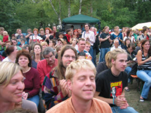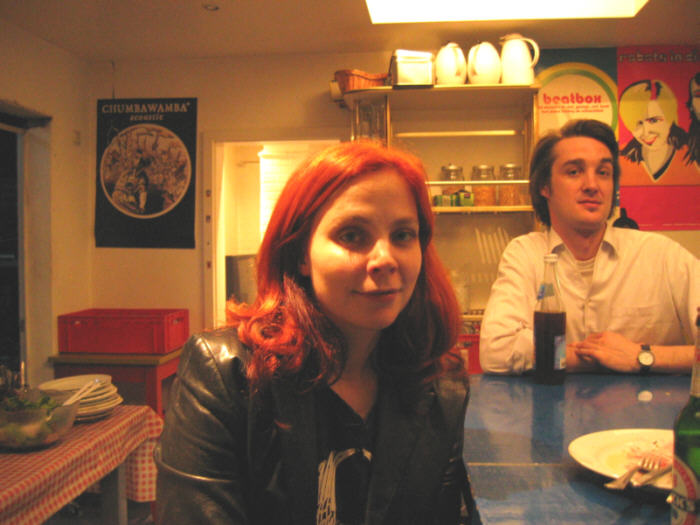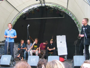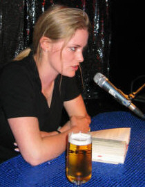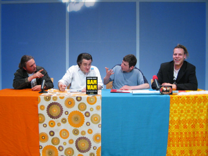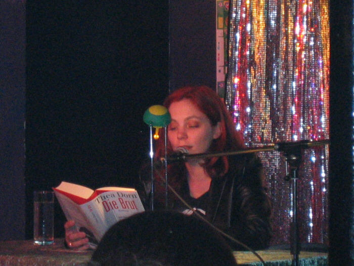 29.9.2005 Gestern in der Räucherkammer Erste Lesung plus Slam nach der Sommerpause. Der Rockkritiker Frank Schäfer hat sich passenderweise Bands angehört, von denen viele auch im Schlachthof spielen, wie heute Abend The Hellacopters. Am späten Abend entschwand er mit einem ebenfalls schwarz gekleideten Rock`n`Roll Fan aus unserer Crew, vermutlich hat sie ihm ihre Plattensammlung gezeigt. Muß ich mal nachfragen. Den kleinen aber feinen Slam mit vier Leuten gewann Volker Strübing aus Berlin, der las im Winnershirt noch zwei Zugaben. ![]() Volker Strübing im gelben Winnershirt (be) 28.8.2005 Gestern beim Slam auf dem Freudenberg Er kam als letzter, nachdem sein Auto versagte und der ICE aus Stuttgart Verspätung hatte, aber er ging als Erster: Der Gewinner beim Slam bei Folklore im Garten heißt, Trommelwirbel, Tobias Heyel. Er hatte schon beim Slam in der Räucherkammer im Februar das Publikum begeistert und wird jetzt Wiesbaden beim German International Poetry Slam vertreten, der findet Ende Oktober in Leibzig statt (siehe unter www.slam2005.de). ![]() ![]() Bühne und Publikum beim Slam! (be) 26.7.2005 Poetry Lesung am 3.8. – Wiesbaden, Platz der Deutschen Einheit Der Wiesbadener Platz der Deutschen Einheit wird zum „Ort für die Kunst„. Noch bis Ende August sind in den Schaufenstern der Jugendverkehrsschule verschiedene Ausstellungen zu sehen. In dem Eckfenster, das auf die Straßenkreuzung von Bleichstraße und Helenenstraße schaut, finden außerdem an jedem Mittwochabend ab 19:00 Uhr verschiedene Veranstaltungen statt – von Theateraufführungen, über musikalische Darbietungen und Fluxus-Performance bis hin zur Poetry-Lesung: am Mittwoch, den 3.8., wird Alexander Pfeiffer aus diesem Fenster heraus den Platz mit urbaner Poesie beschallen. Er wir Passanten, Fahrgästen, Streunern, Trinkern und Zuhörern ein paar obdachlose Texte vor die Füße werfen, auf daß sie sich vielleicht in der einen oder anderen Ohrmuschel einnisten. Straßentexte für ein Straßenpublikum. Da bekommt der antiquierte Begriff von der „Asphaltdichtung„ einen Schlag ins Hyperrealistische. (alex) 23.6.2005 Gestern in der Räucherkammer Das Foto zeigt, noch im Backstage, Heiko Werning, der wird vom Alex interviewt. Heiko Werning war unser Gastautor, mit speziellen Erfahrungen im Larven ausbrüten und verzehren, und Alex hat später ein neues Langgedicht vorgetragen, darin baute er eine Stadt aus diversen alkoholischen Getränken. - Wir erholen uns jetzt von dieser Völlerei und wünschen einen schönen Sommer, Ahoi! (be) ![]() 26.5.2005 Gestern in Räucherkammer Auf den Fotos sieht man unsere Gastautorin Ricarda Junge vor der Räucherkammer in der Abendsonne und in der Räucherkammer. Außerdem ERICH, der wunderbar Akkordeon spielte sowie den Sieger vom Slam im Mai: Thomas Zimmer. Es war sein erster Slam! Nachmachen! Presse war auch da; falls es was Gedrucktes gibt, kann man es die Tage in unserem Pressearchiv nachlesen. Achja, historisches Datum gestern: FC Liverpool gewann mit 6:5 (3:2 i.E.) gegen AC Milan. (be)