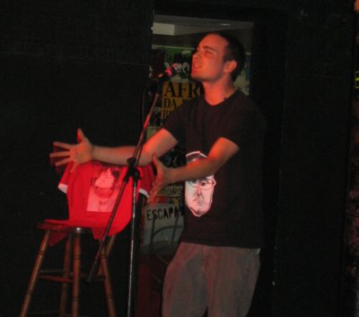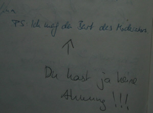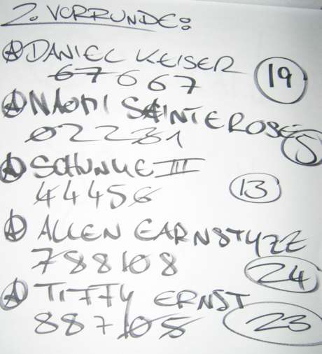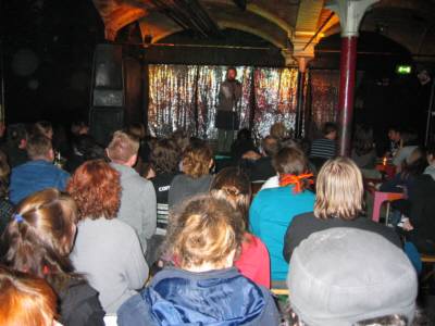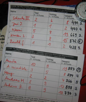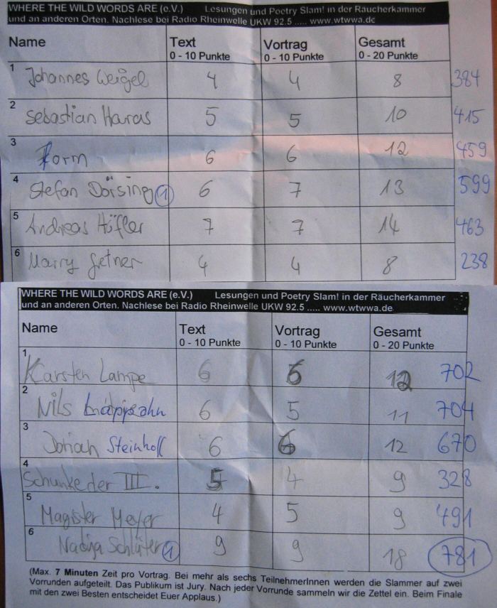 20.8.2009 Sommerwerft 2009 geht los Die Sommerwerft 2009 geht am Freitag an den Start! Vom 21.8. bis 6.9. gibt es täglich ein vielseitiges Kulturprogramm an der Weseler Werft am östlichen Frankfurter Mainufer. Unter anderem zu empfehlen: Das neue Soloprogramm von Etta Streicher, "jetzt oder monotonie" - ein Abend zwischen poetischer Anarchie und Kleinkunstpiraterie, am 1.9. um 20:15h im Beduinenzelt. Und am 25.8. um 19h: Poetry Slam im Beduinenzelt. Mehr Infos unter: www.sommerwerft.de. (be) 4.7.2009 Heute im Q-Kaff Heute ist um 20 Uhr im Q-Kaff in Mainz Heavy-Metall-Slam, im Rahmen der Reihe "Exkursion zur Hölle". Eintritt 3,- Euro. (be) 14.6.2009 Literaturtage Von heute bis zum 20. Juni finden die Wiesbadener Literaturtage statt, diesmal mit Thea Dorn als Gastgeberin. Heute Abend ist im Rathaus Eröffnung plus Podiumsdiskussion unter dem Motto "Oh Du schönes Abendland". Mehr Infos + Programm auf: www.wiesbaden.de. (be) 13.6.2009 Termintip - Slam! Heute abend ab 20h findet in Mainz ein Poetry Slam statt und zwar im Rahmen einer AUSSTELLUNG ZUR ALLTÄGLICHEN ÜBERWACHUNG, welche vom 5.6. bis zum 20.6. läuft. Infos unter: www.all-eyes-on-you.de. (be) 6.6.2009 Termintip - Sonntagsmatinee Morgen, am 7. Juni, ist wieder, ab 12:00 Uhr das Literarische Sonntagsfrühstück - Freier Eintritt, Spende für Essen und Trinken - im Infoladen linker Projekte, im zweiten Hinterhof, Wiesbaden, Werderstr. 8. Fein Frühstücken, Geschichten erzählt bekommen und wer mag, eigene oder fremde Texte mitbringen und vorlesen. (be) 3.6.2009 Neulich in der Räucherkammer Die letzte Veranstaltung vor den Sommerferien hätte ein paar mehr Slammer/innen haben können. Dass es nur sieben Poeten waren, dürfte den wieder zahlreich erschienenen Besuchern kaum aufgefallen sein, Dank der dennoch sehr abwechslungsreichen Texte, Dank des Moderators Hendrik, genannt die Plaudertasche, außerdem gab der Siegers des Poetry Slams, nämlich Tilman Döring, noch eine Zugabe und sowieso gab es ein Dreierfinale mit Tilman Döring, Jens Parker und Andi Höfler. Letzterer bekannte zum Auftakt seines Textes im Finale: "Schunke, ich liebe Dich!" Schöner Moment! Mitschnitte gibt es am Donnerstag in drei Wochen von 18-19 Uhr bei RadioRheinwelle zu hören. (be) 10.5.2009 Mainzer Minipressen-Messe Vom 21. - 24. Mai 2009 findet die Mainzer Minipressen-Messe für Kleinverlagsbücher und künstlerische Pressendrucke mit 360 Ausstellern aus mehr als 15 Ländern und mit großem Rahmenprogramm statt. (be) 4.5.2009 Neulich in der Räucherkammer Letzten Mittwoch hatten wir den zweiten Poetry Slam in Null Neun. Supi wars wieder. Presse war auch da, den Artikel vom 2. Mai gibt es demnächst in unserem Pressearchiv. Mitschnitte gab es schon am folgenden Tag bei RadioRheinwelle zu hören. Das Sendeschema dort hat sich geändert. Vllt. gibt es bei der nächsten Radiosendung am 28. Mai noch ein paar Nachschläge. (be) 1.4.2009 Termintips für April Am 16.4., Einlaß ab 19:30: Poetry Slam in Mainz. Mehr Infos unter: www.poetryslam-mainz.de. Am Sonntag, 19.4. ab 12:00 Uhr: Das Literarische Sonntagsfrühstück, im Infoladen linker Projekte, im zweiten Hinterhof, Wiesbaden, Werderstr. 8. Fein Frühstücken, Geschichten erzählt bekommen und wer mag, Texte mitbringen und vorlesen. Für den Sonntag drauf, das ist der 26.4. empfehlen wir einen Ausflug in die Fasanerie. Dort gibt es von 11.00 bis 17.00 Uhr das Familien-Lesefest unter dem Motto "Wer liest denn da im Wald?" Und dann am 29. 4. den zweiten Wilde Worte-Poetry Slam in Null Neun. Mehr Infos unter Termine. (be) 31.3.2009 Neulich in der Räucherkammer Letzten Mittwoch hatten wir den ersten Poetry Slam in Null Neun. Supi wars und zwar so supi dass das Publikum basisdemokratisch beschloss, es soll schon im April wieder einen Slam geben. Dafür war die große Mehrheit in der brechend vollen Räucherkammer, nur vier votierten für eine Lesung, daneben gab es wenige Enthaltungen. So werden wir uns dem Publikumswillen beugen und am 29.4. wieder einen Slam veranstalten. Diesmal haben 12 Slampoeten mitgemacht, Daniel Keiser war derjenige, der das Winner-Shirt davontrug. Mitschnitte gibts diesen Donnerstag von 18-19 Uhr bei RadioRheinwelle zu hören. (be) 18.3.2009 Termintips Morgen schon, am 19.3. gibts den Poetry Slam in Mainz, Einlaß ab 19:30. Mehr Infos unter: www.poetryslam-mainz.de. Diesen Sonntag, am 22.März gibt es ab 12:00 Uhr wieder das Literarische Sonntagsfrühstück, Freier Eintritt, Spende für Essen und Trinken, im Infoladen linker Projekte, im zweiten Hinterhof, Wiesbaden, Werderstr. 8. Fein Frühstücken, Geschichten erzählt bekommen und wer mag, Texte mitbringen und vorlesen. Und dann noch ein Termintip für nächsten Samstag, am 28.März um 20 Uhr: SEite an SAite - Poetry & Blues mit Karsten "Grohacke" Hohage & Michael Uhl in Wiesbaden, "Kolbenfresser" (Rostocker Str. 12). Mehr Infos unter: www.grohacke.de/seite_an_saite.htm. Und nicht vergessen, den ersten Wilde Worte-Poetry Slam in Null Neun gibts nächsten Mittwoch, das ist der 25. März. Hier könnt ihr gucken, wer sich schon angemeldet hat. (be) 24.2.2009 Neulich in der Räucherkammer So, bitte sehr, unten das Beweisbild. Dirk Bernemann war letzten Mittwoch in der Räucherkammer. Die Lesung war gut besucht, Presse war auch da. Beim Open Mic haben fünf Nachwuchsliteraten mitgemacht, u.a. ein Poetry Slammer aus Mainz, den wir schon unter dem Namen Schunke III. gut kennen. Schunke las diesmal keinen eigenen Text, was auch beim Open Mic okee ist, sondern lieh dem Rollifahrer Stefan Fauk seine Stimme, für dessen Text über eine Physiotherapeutin im gelben Badeanzug. Da war die Presse aber schon wieder weg. Der Artikel vom 20.2.09 ist im Pressearchiv archiviert. ![]() (be) 5.2.2009 Schnitzelwoche! Wir sind auf dem Titel des aktuellen Essenplans der Mensen von Uni und FH in FFm und Wiesbaden. Der wird alle zwei Wochen in Magazinform herausgegeben, das Magazin heißt "ISS WAS". Und im Kurier vom 30.1. gab es einen Bericht über die wi
